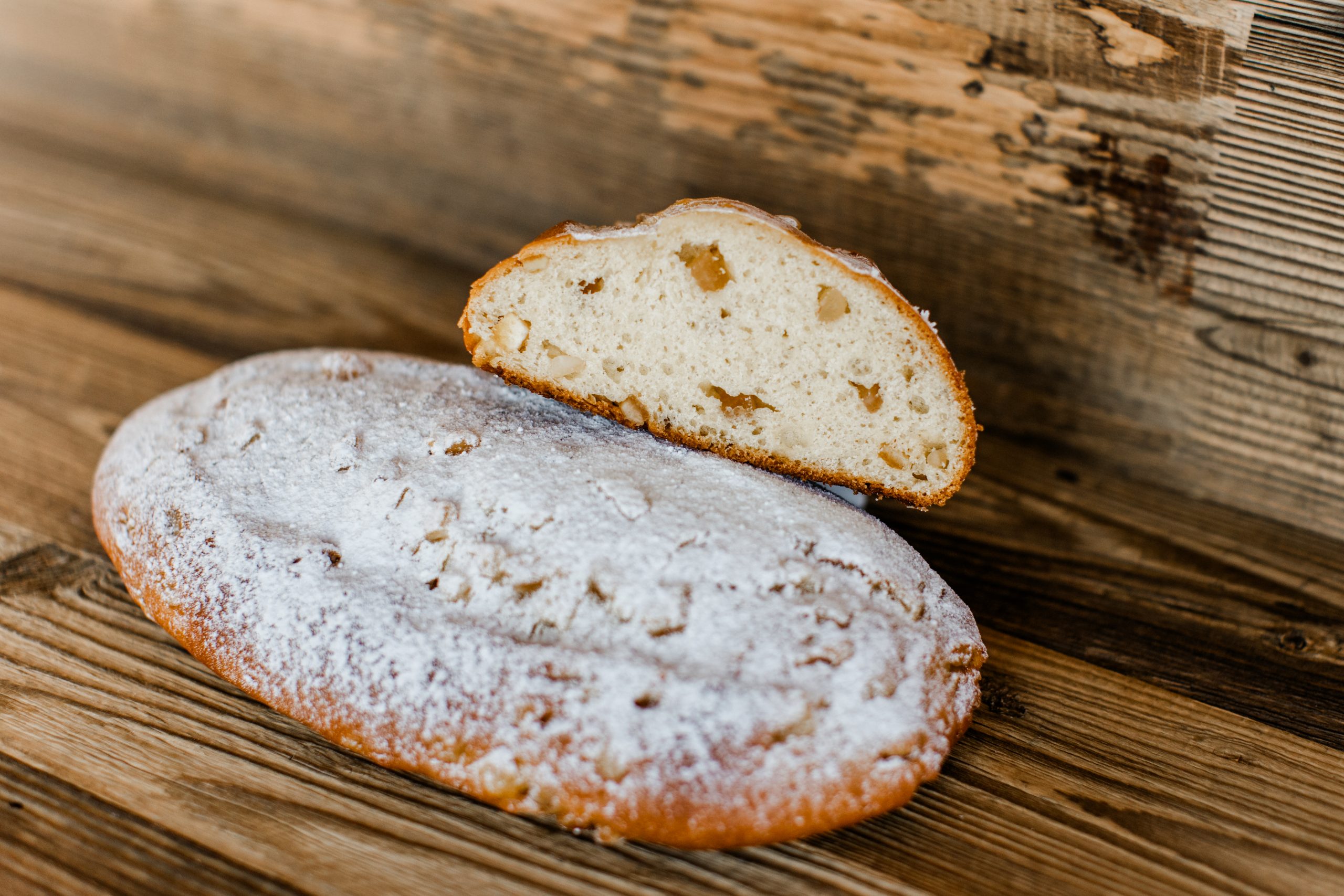 Entdecke unseren einzigartigen Topfenstollen: Ein festliches Gebäck, das mit besonders viel cremigem Topfen (Quark) hergestellt wird und dadurch wunderbar saftig und locker ist. Für die fruchtige Note sorgen ausschließlich fein gehackte Aranzini und Zitronat – klassische Zutaten, die dem Stollen eine dezente, aromatische Süße und einen Hauch von Zitrus verleihen.